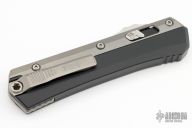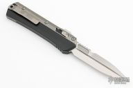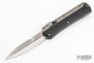 This Glykon by Microtech features a stonewashed double edged blade with fullers and notched thumbrest. The handle has a black aluminum chassis with bead blasted titanium overlays and tip down clip. Comes with original box and papers. Excellent condition. Dated 03/2023 and #699.