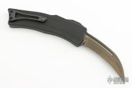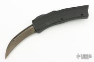This Custom ROC by Heretic Knives features a hand ground DLC coated blade with fullers and notched thumbrest. The handle has a black aluminum chasis with atip down DLC titanium clip with ceramic ball. Fat Carbon Black Dunes inlay in the push button. Comes with original box and COA #156. Excellent Codnition.