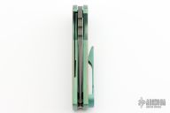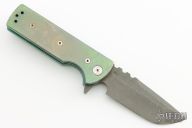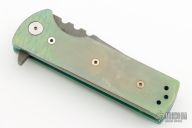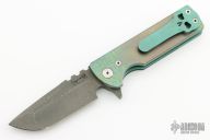 This Chaves T.A.K. features a tumble finished drop point blade with the Chaves logo and a notched thumbrest. The handle has a textured and anodized titanium frame and a matching reversible skull pocket clip. Includes the original box and a plain titanium pocket clip. Excellent condition.
