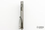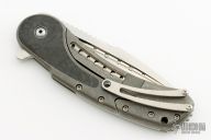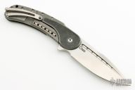 This Bodega flipper by Begg Knives features a satin finish blade and a stonewashed titanium frame with carbon fiber inlays. "Cracked ice" titanium clip, backspacer, and pivot accent. Includes Ceramic IKBS (Ikoma-Korth Bearing System) for smooth and fast opening that requires no wrist action. Extremely well crafted piece. Excellent condition.  Comes with a zippered case.