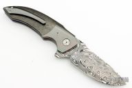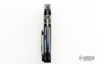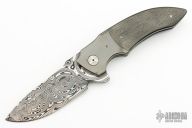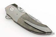 This M35 flipper by Andre Van Heerden features a Damasteel blade with notched thumbrest and flipper. Includes IKBS (Ikoma-Korth Bearing System) for fast and smooth flipper opening that requires no wrist action. The handle has zirconium bolsters, carbon fiber scales, anodized titanium liners, carbon fiber backspacer, and a tip up zirconium clip. Nice blade seating and detent, has a little vertical blade play, has some scratches, otherwise good condition. Comes with a zippered case.