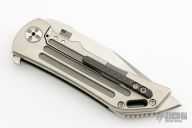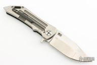 This Dominator by Darrel Ralph features a satin finished, compound ground clip point blade with swedge, notched thumb ramp and flipper. The handle is comprised of a carbon fiber "A" side scale and titanium lockside with carbon fiber tip up clip over a titanium back spacer. Lanyard hole in pommel. Has some light scratches, otherwise excellent condition. Comes with a zippered case.