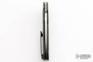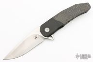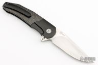 This A2 A3 Bolsterlock flipper from Andre Thorburn and Andre Van Heerden features a hand rub satin finished blade with a false top edge, notched thumbrest and flipper. The handle has a black coated titanium frame with silver lightning strike carbon fiber scales, carbon fiber backspacer, black coated titanium pocket clip that is positioned for tip up carry. Features dual row IKBS. Excellent fit and finish. Very smooth action. Comes with a zippered case. Has some scuffs, otherwise excellent condition.