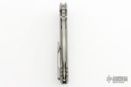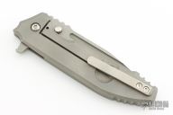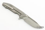 This Peter Rassenti Custom SNAFU integral framelock folder features an acid stonewashed blade with notched thumbrest, flipper and dual thumbstuds. The integral handle is stonewashed titanium with fullers, a titanium clip positioned for tip up carry. Edges have been beveled. Very smooth action, rides on bearings, blade is centered and has no play whatsoever when opened. Outstanding work from Peter. Has some scratches and scuffs, has been resharpened, otherwise good condition. Comes with original box.