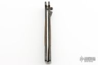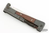 This Early AK-47 Auto features a satin finished blade. The handle has a blued steel frame, canvas micarta scales.  Fires very strong. Has an interesting mechanism. The spring on the spine of the handle is compressed when the blade is closed, and gives the spring extra power when fired. This is an early one. Has some light scratches and patina, has blade play, otherwise good condition.