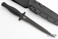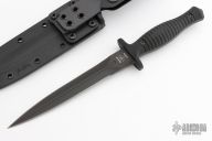 This V-14 Dagger by Spartan Blades is a Les George design, it features a black double edged blade with fuller, .249" blade stock and .900" blade depth. Full tang construction with black G-10 scales. Comes with original sheath and box. Excellent condition.
