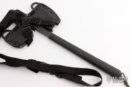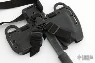 This Shrike by RJM Tactical has a gray duracoat finished blade designed to pierce a kevlar helmet. Handle is molded rubber with 4140 end cap/ glass breaker that houses a sharpening stone. Comes with kydex sheath with shoulder rig. Has some minor wear on the blade and spike, otherwise good condition. #552 on blade.