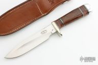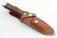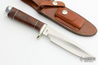 This knife by Martin Knives features a satin finished drop point blade with notched thumbrest and false top edge, .205" blade stock and 1.219" blade depth, hidden tang construction. The handle has a nickel silver guard, desert ironwood burl grip with black, aluminum and stacked leather spacers, aluminum butt. Comes with brown leather sheath. Dated 07 on back of sheath and under ricasso. Excellent condition. #4