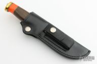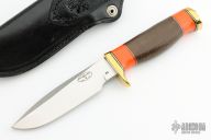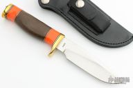 This knife by Martin Knives features a satin finished drop point blade with notched thumbrest and false top edge, .200" blade stock and 1.215" blade depth, hidden tang construction. The handle has a brass guard, orange G-10 and green canvas micarta grip with black, brass and red spacers, brass butt. Comes with black leather sheath. Dated 07 on back of sheath and under ricasso. Excellent condition. #5