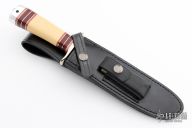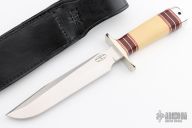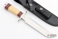 This fighter from Martin Knives features a satin finish clip point blade with sharpened top edge, .210" blade stock and 1.220" blade depth, hidden tang construction. The handle has a nickel silver guard, ivory paper micarta handle with red/brass/aluminum/red linen and aluminum pommel. Includes a black leather sheath with a stone. Excellent condition.  Dated 07