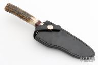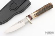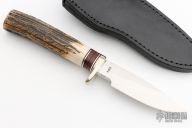 This knife by Martin Knives features a satin finished drop point blade with notched thumbrest, .220" blade stock and 1.001" blade depth, hidden tang construction. The handle has a nickel silver guard, stag grip with black/aluminum/red linen micarta spacers. Comes with black leather sheath. Dated 07 on back of sheath and under ricasso. Excellent condition. #1