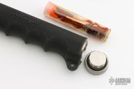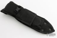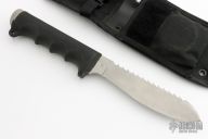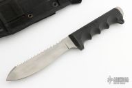 This Survival Knife by Kershaw features a bead blasted blade with sawteeth on the spine, .233" blade stock and 1.432" blade depth, hidden tang construction. The handle has a rubber grip with hollow handle with stainless steel removable butt cap. Original tube and survival items inside handle. Comes with nylon sheath that also holds a wire saw, compass, sharpening stone, etc. Has some light scuffs, otherwise excellent condition. Discontinued in 1988.