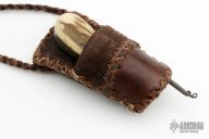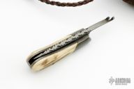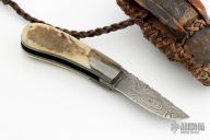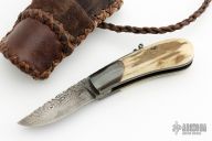 This friction folder by Master Smith Daniel Winkler features a 384 layer Damascus blade with fileworked spine and decorative friction bar. The handle has dovetailed and antiqued steel bolsters, Elk antler scales, antiqued steel liners and Damascus backspacer. Comes with a rawhide and brown leather neck sheath. Really nice example of Daniel's custom work! This knife was part of a limited edition of only 50 knives, this one is #34. Coems with COA stating that these were produced exclusively for ORVIS.