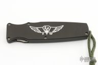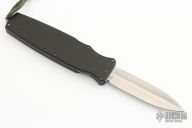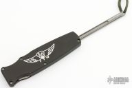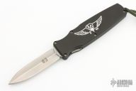 This ASP OTF auto opens by pressing down on the bar on the handle spine. The knife closes by pressing the locking mechanism on the opposite side and pulling the charging handle on the rear. Very strong and fast opening. Both edges of the blade are sharpened. Nicely contoured black aluminum handle. Has a few light scuffs, otherwise excellent condition.