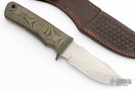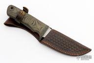 This knife by Allen Blade features a bead blasted blade with false top edge, .170" blade stock and 1.310" blade depth, hidden tang construction. The handle has a black canvas micarta guard and grip with lanyard hole. Comes with a brown leather sheath, not original, but it fits.