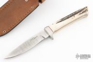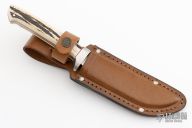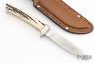 This knife by JT Downie features a Damascus blade with .125" blade stock and .769" blade depth, full tang construction. The handle has a stainless steel guard with stag scales and red liners. Comes with a brown leather sheath, not original, but it fits. Has a few light scratches, otherwise excellent condition.