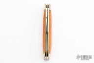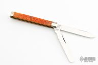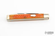 This knife by Schatt & Morgan features 2 mirror polished blades with nail nicks. The handle has nickel silver bolsters, nickel silver shield, brass liners, orange bone covers and stainless springs.  Includes the original box.  Excellent Condition.