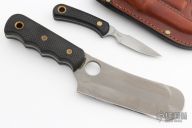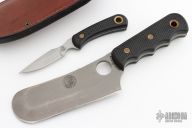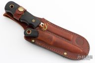 This Combo set from Knives of Alaska features two knives. A large skinner and a caper. All knives feature a bead blasted D2 steel blade with suregrip scales over full tang construction. Includes brown leather double sheath with belt loop. Has some scuffs, otherwise excellent condition.