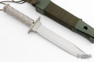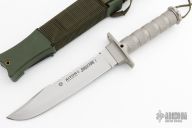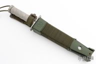 The Jungle King is a fixed tactically designed combat knife that includes a mini survival kit contained within the sheath and handle. The metal end cap is removable and the cast metal handle is hollow to provide a nice water proof storage compartment. An extremely well designed knife with the extras to make it an excellent survival tool. Features Fishing Kit Sewing Kit Scalpel External Applications Nippers Pencil Compass Magnesium Pill Pill Capsule SOS Symbols Signal Mirror Ruler Latex Tubes Forked Pole Multi-Function Skinner Nylon Cord Specifications Blade Length: 8" (205 mm) Overall Length: 14" (355 mm) Blade Steel: Satin Cr Mo Va Stainless Steel, 55-58HRC Handle Material: Cast Metal Sheath Material: OD Green Polyamide with Nylon Cord Weight: 20.5 oz. Knife Only, 2 lbs 3.0 oz. with Sheath Made in Spain Has some scuffs and scratches, otherwise good condition.