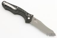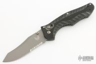 This Contego from Benchmade features a gray partially serrated blade. Black G-10 handle textured in the center and grooved on edges for a better grip. Carbide glass breaker on pommel. Perfect function and strong lock up. Comes with original box, screws and clip. Discontinued. Excellent Condition.