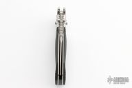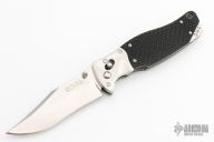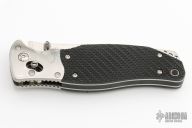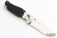 This SOG TomCat Axis Lock Folder has a VG-10 blade with dual thumb studs and a notched thumbrest. Handle is black rubber with satin finished stainless steel bolsters over stainless steel frame with notched thumb rest and black fiber back spacer. Has lanyard hole. Comes with SOG nylon velco sheath, original box and papers. Excellent condition. Still has the plastic covers on the bolsters.