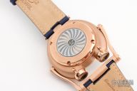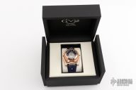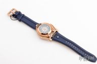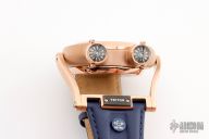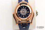Rose gold-tone stainless steel case with a blue leather strap. Fixed rose gold-tone bezel. Blue dial with rose gold-tone arrow-shaped hands and index hour markers. Arabic numerals appear at the 3, 6, 9 and 12 o'clock positions. Arabic numeral minute markers (at 5 minute intervals). Minute markers around the outer rim. Dial Type: Analog. Luminescent hands. Automatic movement. Scratch resistant sapphire crystal. Solid case back. Unique case shape. Case size: 49 mm. Case thickness: 17 mm. Band width: 22 mm. Tang clasp. Water resistant at 50 meters / 165 feet. Functions: hour, minute, second. Triton Series. Fashion watch style. Watch label: Swiss Made. GV2 by Gevril Triton Automatic Blue Dial Blue Leather Men's Watch 3406.