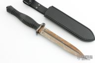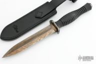 This FS Dagger by Les George and Allen Elishewitz features a double edged blade with fullers, .175" blade stock and .995" blade depth, hidden tang construction. The handle has an anodized titanium guard, carbon fiber grip and titanium butt with lanyard hole. Comes with a black leather sheath by SoulBound leather and a zippered case. Excellent Condition.