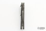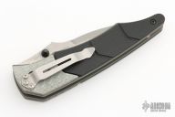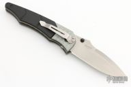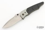 This Snody Design Gravitator folder from Benchmade features a gray spear point blade with dual thumb-studs and a notched thumb-rest. The handle has silver twill bolsters and black G-10 scales, with bead blasted titanium liners and stainless steel posts. Has a stonewashed stainless steel clip. Perfect detent, lockup and blade seating. Has some light scuffs, otherwise excellent condition. Comes with original box and papers.