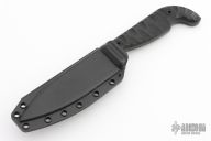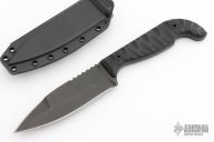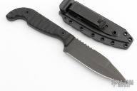 This knife features a black cerakoted blade with a notched thumbrest, .151" blade stock, 1.092" blade depth, full tang construction. The handle has black G-10 scales. Comes with a kydex sheath with clip. Excellent condition.