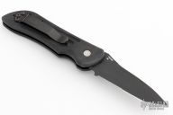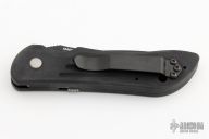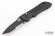 This 9500SBK Mini Auto-Stryker from Benchmade features a black coated tanto style blade with partial serrations and notched thumb rest. The handle is comprised of black anodized and machined aluminum with black coated stainless steel tip up clip and lanyard hole in pommel. Push button release and sliding safety. Comes with original box and papers. Has some scuffs and scratches, great condition otherwise.