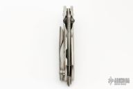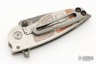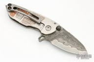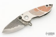 This Hyper Mini Flipper by Direware Custom Knives features a Chad Nichols Armor Core San Mai Damascus blade with swedge, notched thumbrest, and flipper. Full flat grind. The handle has a hand textured titanium frame with super conductor and copper inlays. a Chad Nichols Armor Core San Mai Damascus pointed backspacer and tip up clip. Nice blade seating, detent and lock up, rides on bearings. New from maker.
