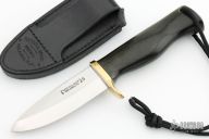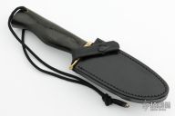The Fireman Special is one of Randall's non-catalog knives, it has a satin finished blade with notched thumbrest, .228" stainless blade stock and 1.218" blade depth, full tang construction. Extra-heavy beveled blade. The handle has a brass guard, black linen micarta handle. Comes with high ride black leather sheath. Excellent condition.