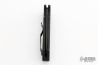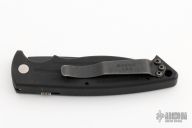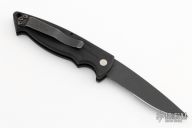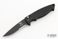 This Mini Reflex by Benchmade features a black partially serrated blade and a black aluminum handle with black stainless steel tip up clip, lanyard hole at the butt and safety on the spine. Comes with nylon belt sheath. Has some light scuffs and scratches, great condition otherwise.