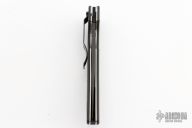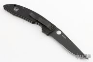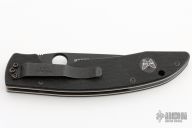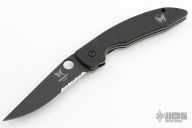 This 800SBT Linerlock folder by Benchmade has a black blade with partial serrations, thumb hole, and notched thumb rest. Handle is black G10 over titanium liners, black fiber back spacer, lanyard hole, and black stainless steel tip down clip. Comes with nylon belt sheath. Has a few light scuffs, otherwise excellent condition.