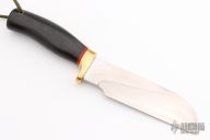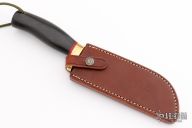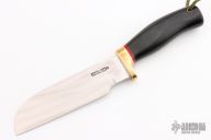 This Chef's Knife by Randall Made Knives features a satin finished blade with notched thumbrest, .232" blade stock and 1.588" blade depth, hidden tang construction. The handle has a brass guard, red spacers, black linen micarta with a comfortable handle grip, wrist thong. Designed for kitchen use. Comes with a brown leather sheath, orange stone and a paracord bracelet. Excellent condition.