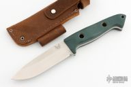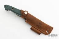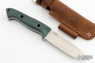 This Bushcrafter from Benchmade features a drop point tumble finished blade with .165" blade stock and 1.156" blade depth, full tang construction. The handle is comprised of green G10 scales over red liners and full tang construction with hollow pins and a lanyard tube with lanyard. Includes leather sheath with a belt loop, original box and papers. slight cut in the sheath at blade entrance. Excellent Condition.