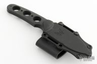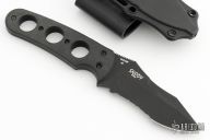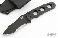 This fixed blade features a black partially serrated blade with a false top edge and notched thumb rest. Black G-10 scales with 3 holes. Black Kydex sheath with belt loop. Full tang construction with 1/8" blade stock and 1 1/4" blade depth. Has been used. Has scratches and scuffs on the blade. DISCONTINUED MODEL. Blade Steel: 154CM