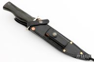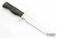 This Model 16 Special Fighter from Randall Made Knives has a satin finished stainless steel clip point blade with sharpened top edge, .220" blade stock and 1.210" blade depth, full tang construction. Handle has black linen micarta handle, nickel silver guard and lanyard tube. Stainless steel blade. Comes with black leather sheath with copper rivets and a Randall zippered case. Excellent condition.