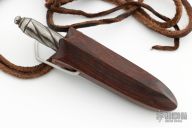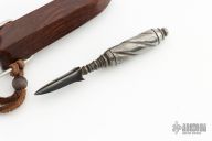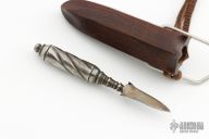 This hidden spike knife by Hidetoshi Nakayama features a chisel ground blade with turned and spiral fluted handle. The knife/spike fits in a wooden scabbard with latch on top and can be used as a keychain or a necklace. Very cool piece. Totally handmade. The knife fits into the scabbard very snuggly, probably needs to be reamed out a little, otherwise excellent condition.