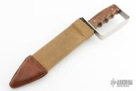 This 1917 Bolo Style D-Guard Fighter by Mick Langley features a mirror polished blade with a sharpened top edge, .235" blade stock and 2.055" blade depth, hidden tang construction. The handle has a stainless steel D-guard and walnut grip. Comes with an original 1918 scabbard. Has a few light scratches, otherwise excellent condition. Comes with a zippered case.