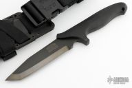 This Specwar Fixed Blade by Timberline Knives features a black  tanto chisel ground blade, @ 60 RC, 0.200" blade thickness and 1.393" blade depth. The handle is fiberglass reinforced nylon with a stainless steel butt plate for striking. Comes with original sheath. This collaboration between Ernie Emerson and Vaughn Neeley won "American Made Knife of the Year" at the 1995 Blade Show. Excellent condition. Hard to find. Has some light sheath marks. Comes with a zippered case.