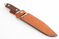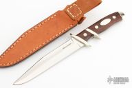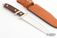 This Sub-Hilt Fighter by Dave McDearmont features a mirror polished blade with sharpened top edge, .177" blade stock and 1.225" blade depth, full tapered tang construction. The handle has a nickel silver guard, sub-hilt and rear bolsters, cocobolo scales with nickel silver pins and red liners. Comes with a brown leather sheath and a zippered case. Has a few very light scratches, otherwise excellent condition.