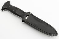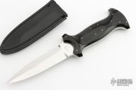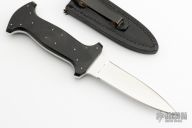 This Boot Dagger by Jody Samson features a mirror finished double edged chisel ground blade with hollow ground B-side, .165" blade thickness and 1.071" blade depth, full tang construction. The handle has black linen micarta scales, one is flat and one is rounded. I imagine the flat side is intended to go against your leg. Comes with a black leather boot sheath and a zippered case. Excellent condition.