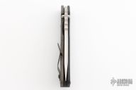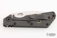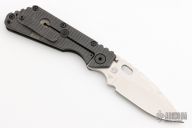 This SMF framelock folder by Mick Strider features a stonewashed drop point blade with a notched thumbrest.  The handle features a textured G-10 scale and a tiger striped titanium lockside with a matching tip up pocket clip. Has a few light marks on the clip, otherwise excellent condition.