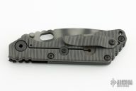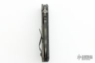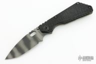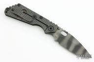This SNG framelock folder by Mick Strider features a tiger stripe blade and a dimple pattern black G-10 and flamed titanium frame and tip up titanium clip. Includes a "Lock Bar Stabilizer" for maximum reverse lock retention. Nice detent, lockup and blade seating. New condition.