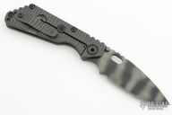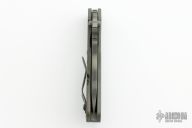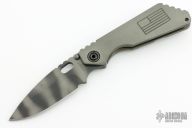 This SNG framelock folder by Mick Strider features a tiger stripe blade and a grey aluminum w/ Flag and flamed titanium frame and tip up titanium clip. Includes a "Lock Bar Stabilizer" for maximum reverse lock retention. Nice detent, lockup and blade seating. New from maker at the 2023 Blade Show.