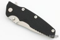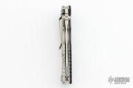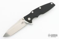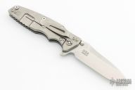 This Eklipse by Rick Hinderer features a stonewash finished blade with notched thumbrest and flipper. The handle has a stonewashed titanium frame, black G-10 scale, satin hardware, and a tip up or down reversible stonewashed and anodized titanium clip and filler tab, lanyard hole at the butt. New condition. Comes with original box and extra pivot hardware.