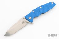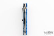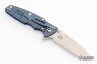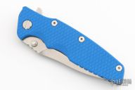 This Eklipse by Rick Hinderer features a stonewash finished blade with notched thumbrest and flipper. The handle has a battle blue titanium frame, blue G-10 scale, satin hardware, and a tip up or down reversible stonewashed and anodized titanium clip and filler tab, lanyard hole at the butt. New condition. Comes with original box and extra pivot hardware.