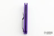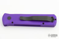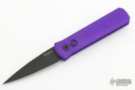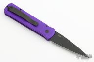 This 721 Godson from Pro-Tech Knives features a black spear point blade with swedge. The handle has a purple anodized aluminum frame with a stainless steel tip up clip. Includes original box and paperwork. New front maker!