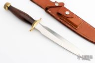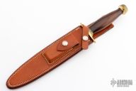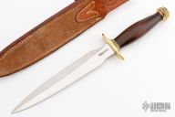 The Model 2-7 by Randall Made Knives is a heavily made dagger or dirk. Brass guard with scalloped collar, rosewood handle, brass scalloped butt cap with tang nut, black spacers. Double edged satin finished blade, .199" blade stock and 1.225" blade depth, hidden tang construction. Comes with a Tight Stitched Johnson Roughback brown leather sheath. Excellent condition.